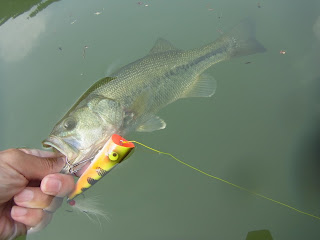 I was very much pleased with today's fishing after catching this fish with one of my favorite wood baits, so I tried an unsual lure for fun. I've not used it for long, but I have many of them. Yes, Bomber Speed Shad. A prop is attached on the tail of almost all of my Speed Shad lures, and I like using them as a topwater bait. Its action is very shad-like, and some young bass could not but jump to it to bite. I caught a few bass and lost a few, too. I got completely satisfied and went home.